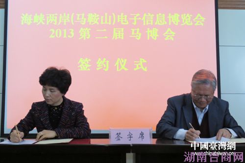 中国台湾网3月21日马鞍山消息 日前,安徽省马鞍山市副市长王晓焱和台湾电机电子工业同业公会秘书长陈文义在马鞍山市开发区管委会签订协议,共同举办海峡两岸(马鞍山)电子信息博览会。