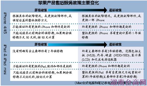 同时,按照各产品线,苹果明确写出了包括iPhone 5、iPhone 4S以及iPad 等各产品的服务条款。本报记者发现,多个产品的售后服务内容作出了调整。其中包括iPhone 4和iPhone 4S保留后盖的整体换修方式,以及整机更换后产品保修期如何计算,是否使用全新部件进行维修等内容,苹果公司都作出了修改。(文/表 记者段郴群)