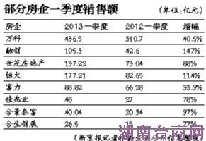 综合目前已经披露一季度销售业绩的房企情况看,不少房企增速更高。融创今年前3月实现销售金额105.3亿元,同比增长147%;恒大1-3月销售177.2亿元,同比增长114.4%;世茂房地产首季度销售137亿元,同比上升88%,完成全年销售目标25%。此外,如富力、合生创展、佳兆业、花样年等上市房企,一季度销售也有30%-80%不等的增幅。