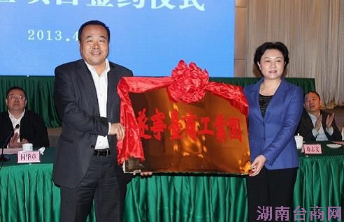 四川省政府副秘书长吴显奎(左)为遂宁授“遂宁台商工业园”牌匾,遂宁市副市长邓为(右)接牌。