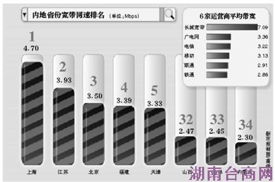 报告显示,一季度中国网民平均上网带宽为3.14Mbps。全国省级行政区中,内地网速最快前五名分别为上海(4.70Mbps)、江苏(3.93Mbps)、北京(3.50Mbps)、福建(3.39Mbps)、天津(3.33Mbps),而山西、吉林和内蒙古则分别以2.47Mbps、2.45Mbps和2.30Mbps的成绩排名最末。