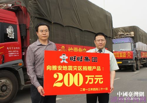 中国台湾网4月22日雅安消息 4月21日,旺旺集团向芦山地震灾区捐赠的10车食品、饮用水等急需物资运达灾区。捐赠的物资总价值达200万元人民币,包括3000箱牛奶、5000箱酸奶和10000多箱旺旺饼干等。在旺旺集团成都仓库装车启运前,四川省台办副主任张军代表接收该批赈灾物资。(中国台湾网、四川省台办联合报道)