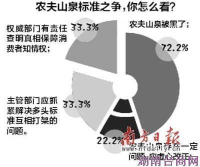 还有33.3%的人选择了“主管部门应抓紧解决多头标准互相打架的问题”。北京市国凯律师事务所律师钟兰安表示,天然饮用水行业标准很多,有国家标准、地方标准等。在农夫山泉双方“对掐”的背后,质检部门应该制定一个权威的标准出来,只有这样,企业可以按照唯一的丈量尺度来规定自己产品的标准,避免以后类似农夫山泉“标准门”事件再次发生。 南方日报记者 周照