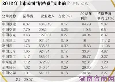 以中国交建为例,2012年中国交建的营收规模为2962亿元,几乎与2011年(2953亿元)持平,但2012年其业务招待费用从前一年的6.45亿元上升到了7.79亿元,上升了21%。