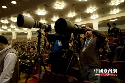 3月3日下午,全国政协十一届三次会议在北京人民大会堂开幕,图为各路记者在人民大会堂拍摄开幕式盛况。(肖春阳、刘洋摄影报道)