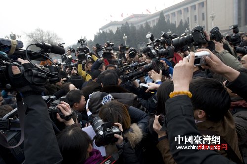 3月3日下午,全国政协十一届三次在北京人民大会堂开幕,委员们在人民大会堂前受到记者的围访。(肖春阳、刘洋摄影报道)