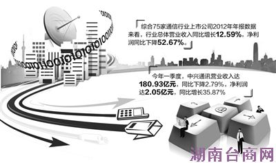 综合75家通信行业上市公司2012年年报数据来看,行业总体营业收入同比增长12.59%,净利润同比下降52.67%。其中,通信设备子行业62家通信设备上市公司营业收入同比增长4.24%,净利润同比下降83.04%。