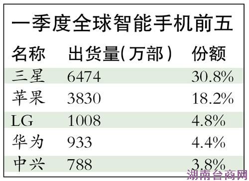从各厂商来看,在全球智能手机市场,三星份额达到30.8%,同比增长3.2%,苹果在2013年第一季度的销量为3830万部,占智能手机销量18.2%。而中国的华为和中兴销量挤入了全球智能手机的前五名,销量分别是933万部和788万部,市场份额分别为4.4%和3.8%。
