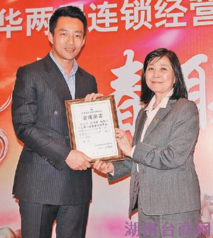 汪小菲(左)日前担任中华两岸连锁经营协会荣誉副理事长,由台财政部门前负责人刘忆如代表颁发当选证书。图片来源:台湾《联合报》