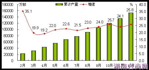 2013年全年,我国手机产量达到14.6亿部,增长23.2%,增速比上年提高18.9个百分点。据IDC发布的2013年全球手机18亿部的出货量测算,我国产量占全球出货量份额达到81.1%,比2012年提高10个百分点以上,我国全球手机生产制造基地的位置得到进一步稳固。从全年产量走势来看,呈平稳较快增长态势,除三、四月份累计产量增速相对较低以外,其余各月累计产量增速均在20%以上。