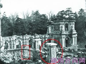 1873年拍摄的圆明园残迹,红圈处就是类似的石刻构件。