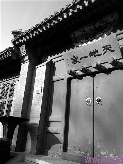 走进公园,北侧有一排红色大门灰白墙体的老式建筑,房屋的正门上分别写有“天地一家”,“天趣园”,“福田园”,还有两间房屋未挂牌匾。