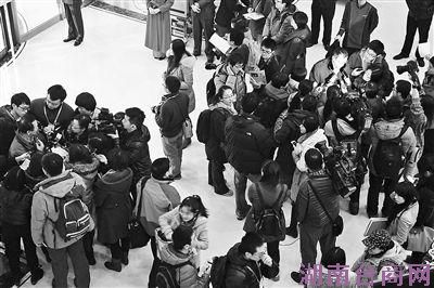 昨天上午,参加市政协十二届二次会议的政协委员陆续报到,被守候在门口的媒体记者“围追”摄影/本报记者魏彤