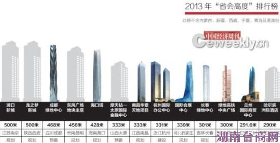 中国经济周刊》记者通过走访、对照《摩天城市报告》及公开资料,制作出“2013年全国省会城市高度排行榜”,即以一个省会城市已建成、在建、规划或论证阶段的“第一高楼”代表这个城市的高度并进行排名。统计发现,最高的省会城市是长沙,高度为838米;最低为哈尔滨,高度为288米。其中,高于600米的有4个城市,500~600米之间的有11个城市,400~500米之间的有3个城市,300~400米之间的有6个城市,低于300米的只有两个城市。