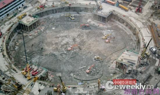 现场的一名工作人员向《中国经济周刊》介绍,两年多来,武汉绿地中心陆续实施挖坑、连续墙、工程桩、土方等工程,主体结构在2014年有望从地下“长”出地面,预计2017年完工。