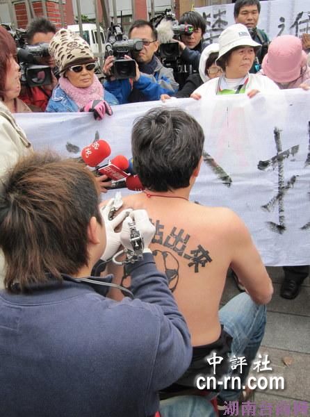 资料图:台湾博士朱政麒在寒风中赤裸上半身,刺上人民站出来反对美国牛肉进入台湾。(中评社 黄筱筠摄)