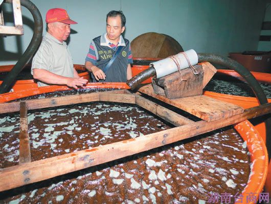 台北市调处昨天至一江食品公司新北市五股的工厂调查问题酱油流向,发现酱油贮存桶表面满是霉菌,员工(左)解释说,因上月遭新北卫生局查扣无法加工,才会有这种现象。(摄影:林昭彰)