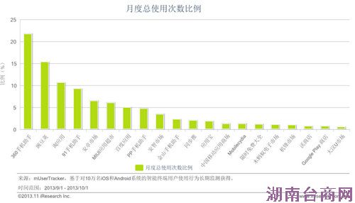从使用次数的数据来看,360手机助手占比为21.7%,第二位是豌豆荚15.3%,淘应用已经迅速增长到第三位10.6%,91手机助手为9.2%。从用户使用的应用商店下载应用的次数来看,360优势依旧明显,豌豆荚紧随其后,百度系的91手机助手、安卓市场、百度应用加在一起才能与360接近。