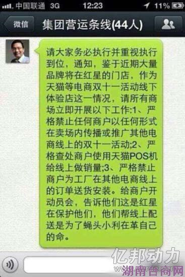 车建新:严禁任何商户以任何形式在卖场内传播或推广其他电商线上的“双11”活动;严格查处商户使用天猫POS机给线上做销量;严格禁止商户为工厂在其他电商线上的订单送货安装。给商户开动员会,告诉他们,这是红星在保护他们,他们帮线上做配送是为了蝇头小利革自己的命。