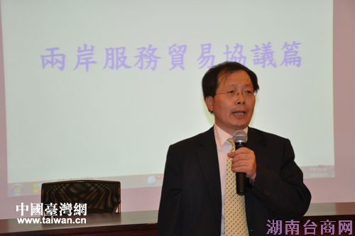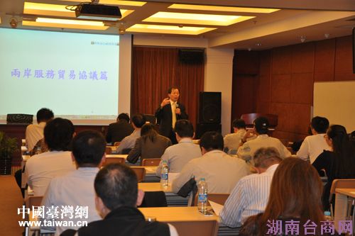 作为在大陆地区为台商企业讲解的第五场研讨交流活动,袁明义从“两岸服务贸易协议”商机展开研讨交流。他首先介绍了“服贸协议”在商业服务、通讯、建筑、配销、环保、健康与社会、观光旅游、娱乐文化活动、运输、金融、及其他开放项目上台湾对大陆、大陆对台湾开放的具体领域及项目,并分别分析了各自进入的优势与劣势。同时还介绍了跨界经营、境外消费、商业存在、自然人存在的服务贸易“四种模式”。袁明义表示,就目前来看,台湾对大陆开放的相关项目,大部分不会影响到台湾的产业发展,而对大陆而言,只有20%的产业会受到冲击。所以他希望台湾方面应该加快“服贸协议”的通过,使两岸的产业能够融合发展。