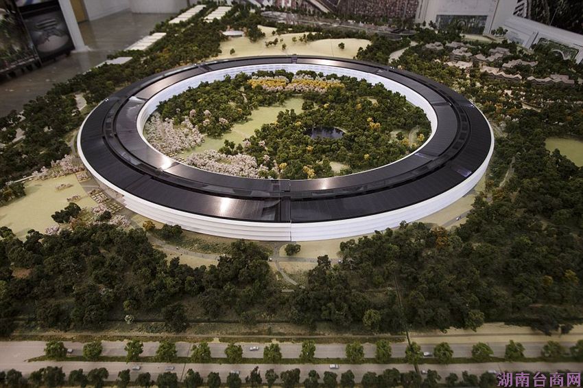 资料图:据英国《每日邮报》10月14日报道,美国苹果公司新总部的巨型沙盘模型被公之于众。新总部从外观看像一艘宇宙飞船,是由已故前CEO史蒂夫.乔布斯早于2011年便设计申请建设。这一环形建筑有玻璃幕墙,太阳能电池板,以及7000棵树,从而组成一处封闭的“植物园”。