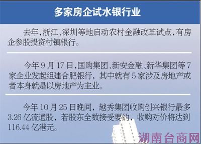 “一方面,金融业被视为回报率高的行业,因此房地产企业都在热衷开拓,另一方面,进军银行业可以给开发商自身融资提供一定程度的便利。”一位股份制银行相关业务负责人张先生表示。
