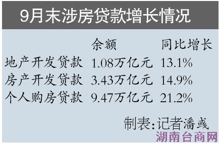 报告数据显示,9月末,地产开发贷款余额1.08万亿元,同比增长13.1%,增速比上季末回落4.1个百分点。房产开发贷款余额3.43万亿元,同比增长14.9%,比上季末回升3.9个百分点。个人购房贷款余额9.47万亿元,同比增长21.2%,增速比上季末高0.1个百分点;1~9月增加1.37万亿元,同比多增6931亿元。