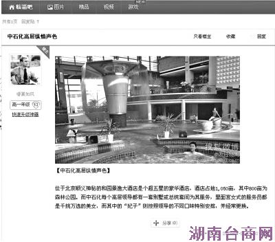 在该篇注明摘自“上海滩”的博文中,不仅罗列了和园景逸大酒店是中石化高层的后宫,同时还将中石化“牛郎门”等罗列其中。