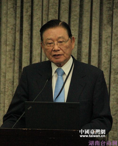 台湾海基会前董事长江丙坤在“两岸产经合作与创新发展论坛”上致辞。(中国台湾网 扶海涛 摄)