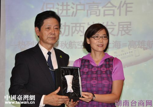 高雄观光局副局长刘显惠(右)向春秋航空董事长王正华(左)赠送礼品。(上海台协 玉龙 摄)