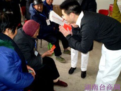 赖信文(右一)于安徽全椒县敬老院关怀活动中,为老人送上百岁红包,祝贺新年。