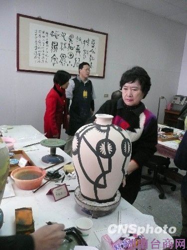 规模空前的华人艺坛盛事、集结百年来500位两岸四地华人艺术家200件作品的《百年华人绘画大观·世界巡回大展》,即将于5月1日在上海世博会上做全球巡回展的宣传站。配合此项展览的《金酒如画一华人艺术家金门彩绘金酒》活动正在台湾金门展开。图为台湾著名女画家李重重在陶瓷上作画。中新社发 闫晓虹 摄