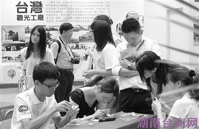 台博会上,台湾观光工厂主题馆内熙熙攘攘,DIY体验区内,砖雕彩绘、缎带兔吊饰、植物精油项链等趣味盎然的免费DIY活动,让市民们玩得不亦乐乎;交流洽谈区内,一拨又一拨有意发展观光工厂的本地制造业企业,则虔诚地前来“取经”。