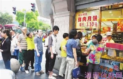 南京路上老字号食品店门前,等候现烤现卖鲜肉月饼出炉的消费者天天排长队 特约通讯员 杨建正 摄影报道