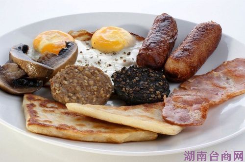 培根、煎蛋、黑香肠(血肠)、白香肠(没有血的血肠)、炸土豆、苏大面包等组成爱尔兰营养丰盛又美味的早点。在爱尔兰不同的地方就餐,就会有不同的早餐搭配。通常会配上一杯果汁或一杯茶,甚至在一些酒吧里,人们会就着吉尼斯黑啤酒吃这美味的早餐。