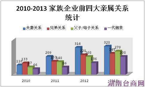 通过我们4年对中国家族企业的跟踪调查发现,家族企业中的主要亲属关系变化几乎可以说是中国家族企业发展的缩影,在调查中显示,2010年时,兄弟关系在企业家族成员中尚处于首要地位;而随后两年中,创业板的诞生刺激了大批中小家族企业的集体上市,“夫妻档”的比例也同时呈直线上升,而随着第一代企业家年龄的增长,子女等二代们开始进入企业并扮演日益重要的角色,今年父(母)子(女)的关系数量首次超越了兄弟关系,以将近4成的比例成为第二大亲属关系。