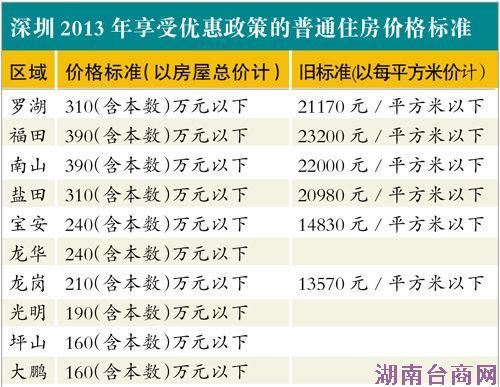记者发现,新规中享受优惠政策的普通住房总价标准最高的区域为福田和南山,为390万以下(具体标准见右表)。