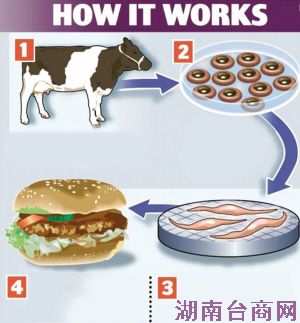 从牛身上提取部分肌肉组织 最后用2万条肉条制成肉饼 再从肌肉组织中分离出干细胞 干细胞放在营养液中培养,形成小"肉条" 人造牛肉汉堡制作过程示意图