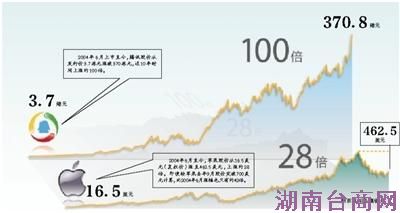 腾讯的这种上涨幅度,将科技股中的翘楚苹果公司也远远抛在了身后。2004年6月至今,苹果的股价上涨约28倍。即便按苹果去年9月股价突破700美元计算,比2004年6月也只上涨约42倍。