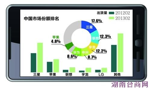 该公司数据显示,2013年2季度,在全球智能手机市场,前五名中三星、苹果、联想、宇龙、LG的市场份额分别是32%、13%、5%、5%、4%。华为、中兴、小米分别排到第6、第7、第12位。中国本土手机厂商在过去一年中销量飙升。宇龙、联想、华为、中兴和小米,已占到全球品牌智能手机市场的20%。报告称,中国厂商的出货量比去年同期增长108%。