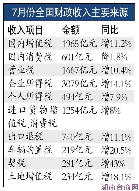 数据显示,7月份,全国公共财政收入11849亿元,同比增长11%。其中,中央财政收入同比增长8.8%,地方财政收入(本级)同比增长13.5%。本月中央财政收入增幅延续上月回升态势,主要是受年度间退税不可比以及去年同期收入基数较低等因素影响。