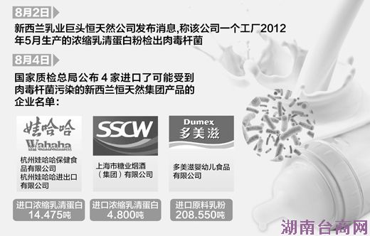 新西兰乳业巨头恒天然公司日前通报部分产品检出肉毒杆菌,引起国内消费者广泛关注。8月4日,国家质检总局公布了4家进口了可能受到肉毒杆菌污染的新西兰恒天然集团产品的企业。目前,有关部门已开展检测、封存工作,涉及企业也已经对问题产品采取追查、召回等措施。