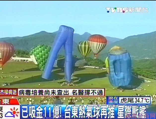 今天上午,4颗不同造型的热气球展出,有高达17层楼的隐形牛仔裤和星际战舰造型的飞碟球等。人潮带动钱潮,热气球的周边商店也非常夯,平均下来,一天就能有3万元的营业额。业者说:“纪念品卖的很好啊,有些纪念品甚至卖断货了。”(中国台湾网 朱炼)