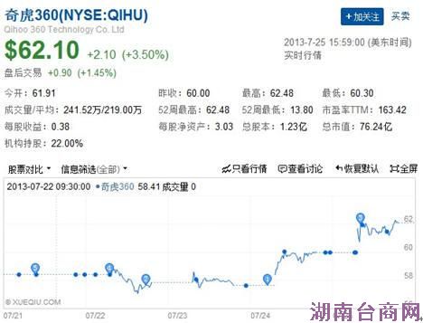 26日消息,继昨日冲入60美元大关后,今日奇虎360(NYSE:QIHU)股价再创新高达62.10美元,上涨3.50%,盘中股价最高达62.48美元,总市值已达76.24亿美元,80亿美元市值指日可待,遥望百亿美元,而7月份以来,360股价已经由46.9美元上涨至62.1美元,涨幅高达32.4%。分析师认为,360公司各项业务的利好消息将继续支持其在资本市场的强势表现。