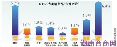 公布的数据显示,从八大类消费品上看,6月份“六升两降”,仅烟酒及用品、交通和通信等下降,其余六大类全部上涨,食品和居住类价格涨势最大。6月份食品价格同比上涨5.7%,影响CPI上涨约1.54个百分点。其中,鲜菜价格上涨21.2%,影响CPI上涨约0.29个百分点,与上月相比涨幅扩大了28.2%。鲜果价格上涨18.7%,影响CPI上涨约0.32个百分点,与上月相比涨幅扩大了16.1%。