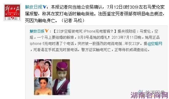 前天,微博上的一条信息引来网友大量转发和关注,23岁的空姐疑使用正在充电的iPhone5触电身亡,昨天,苹果中国公司发布官方声明称,对这一不幸事件深感痛心,将对此事彻底调查,并向有关机构提供全力配合。