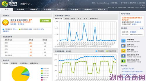 与个人版安全软件不同,360企业版独有“安全可视化”界面,通过图标方便管理员的操作。企业管理员可清晰看到内网电脑的安全体检得分,病毒、木马、漏洞、危险项数量,每台终端电脑的健康状况、使用情况、是否卸载等,简化了管理成本,防止针对某台不安全电脑的攻击造成企业网络安全“木桶效应”的发生。