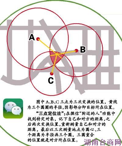 所谓的微信定位功能是指:以三个不同的地方为圆心,"查找附近的人"显示的距离为半径,划出3个圆。而在这个3个圆的交点位置,就是目标微信用户的具体位置。这种方法在数学上被称作三点定位比较测量法,是根据这个定律来测量的。这个消息传出以后,不少微信用户担心不已,甚至有网友表示"再也不敢用微信了。"怕自己的行动被泄露。