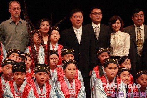 “世界的孔子:孔庙与祀典国际学术研讨会开幕式暨佾舞交流展演”3月19日在台北市府推出,盛大的台湾春季祭孔活动由此拉开帷幕。图为台北市市长郝龙斌在出席开幕式时与来自台湾国小的孔庙佾舞团小演员们合影。中新社发 闫晓虹 摄