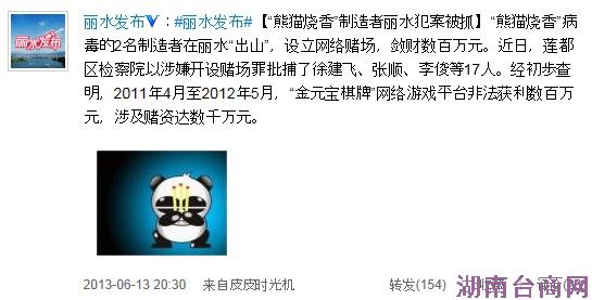 据微博介绍,“熊猫烧香”病毒的两名制造者在丽水“出山”,设立网络赌场,敛财数百万元。经初步查明,2011年4月至2012年5月,“金元宝棋牌”网络游戏平台非法获利数百万元,。